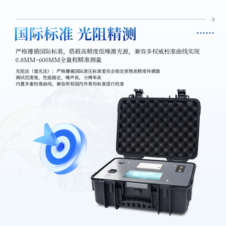 该款便携式油液颗粒计数器是依据GB/T 18854-2002(ISO11171-1999)等国家及国际标准研制的专门用于油液中污染度等级检测的仪器。适用于液压油、润滑油、岩页油、变压器油(绝缘油)、汽轮机油(透平油)、齿轮油、发动机油、航空煤油、水基液压油、磷酸酯油等油液进行现场、实验室的污染度检测。也可安装在各种液压传动、滤油机、清洗机、检测试验台等系统上,实现对系统油液清洁度在线检测。可广泛应用于航空航天、电力、石油、化工、交通、港口、冶金、机械、汽车制造等领域。