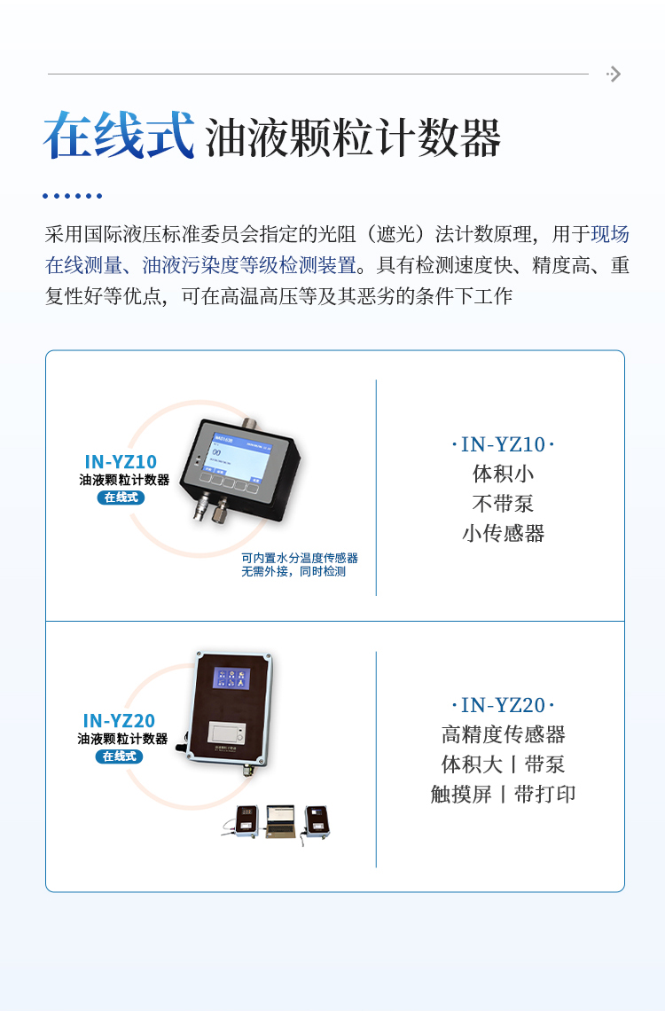 简要描述: 油液颗粒污染度检测仪IN-YT20依据GB/T18854-2002-(ISO11171 -1999)等标准。采用光阻(遮光)法计数原理研制,完全符合相应国军标、国家标准及国际标准。可提供快速、准确、可靠、可重复的检测结果及完整的污染监测分析报告,适用于液压油、润滑油、抗燃油、绝缘油和透平油等颗粒污染度的检测。可广泛应用于航空、航天、电力、石油、化工、交通、港口、冶金、机械、汽车制造等领域。