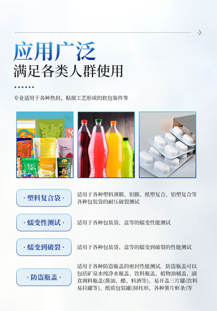 泄漏与密封强度测试仪,专业适用于各种热封、粘接工艺形成的软包装件、无菌包装件等各封边的封口强度、热封质量、以及整袋胀破压力、密封泄漏性能的量化测定;对软包装袋所使用材料的抗压强度、耐破强度等指标分析;各种塑料防盗瓶盖密封性能、瓶盖连接脱扣强度、材料的应力强度的量化测定;瓶体密封性、抗压性、耐破性等评估分析。通过正压法来进行测试,模拟实际使用环境下的密封强度、泄漏性能和耐压极限,为各行业的包装质量管控提供可靠的依据。
