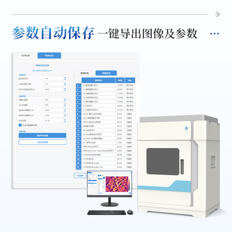 简要描述: 叶绿素荧光成像仪是一款专业的植物光合作用研究仪器,采用高灵敏度CMOS相机和LED光源控制,实现对植物叶片叶绿素荧光的快速、无损检测与成像分析。系统集成了OJIP快速荧光动力学测量和PAM调制荧光测量两大核心功能,能够全面评估植物光合系统的活性、光能利用效率以及环境胁迫响应。