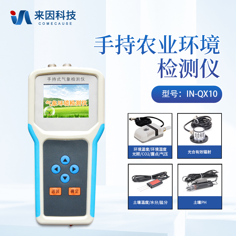 简要描述: 手持式智能农业气象环境检测仪IN-QX10是我们专门针对农田、草场局部小尺度环境设计的,对与植被和农作物生长密切相关的土壤、水气等环境参数监测的农田小气候站。它主要观测与农业相关的空气温度、空气湿度、光照强度、二氧化碳浓度、露点温度、光合有效辐射、土壤温度、土壤湿度、土壤盐分、土壤PH等10个环境参数气象要素,为农业科研、农业生产等提供良好的支持。