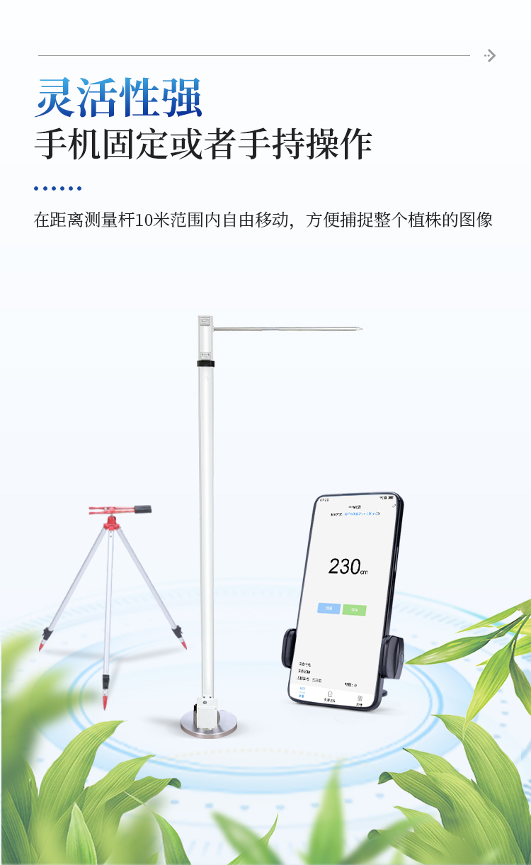 5、灵活性强 - 手机可以固定或者手持操作,在距离测量杆最远10米范围内自由移动,方便捕捉整个植株的图像。