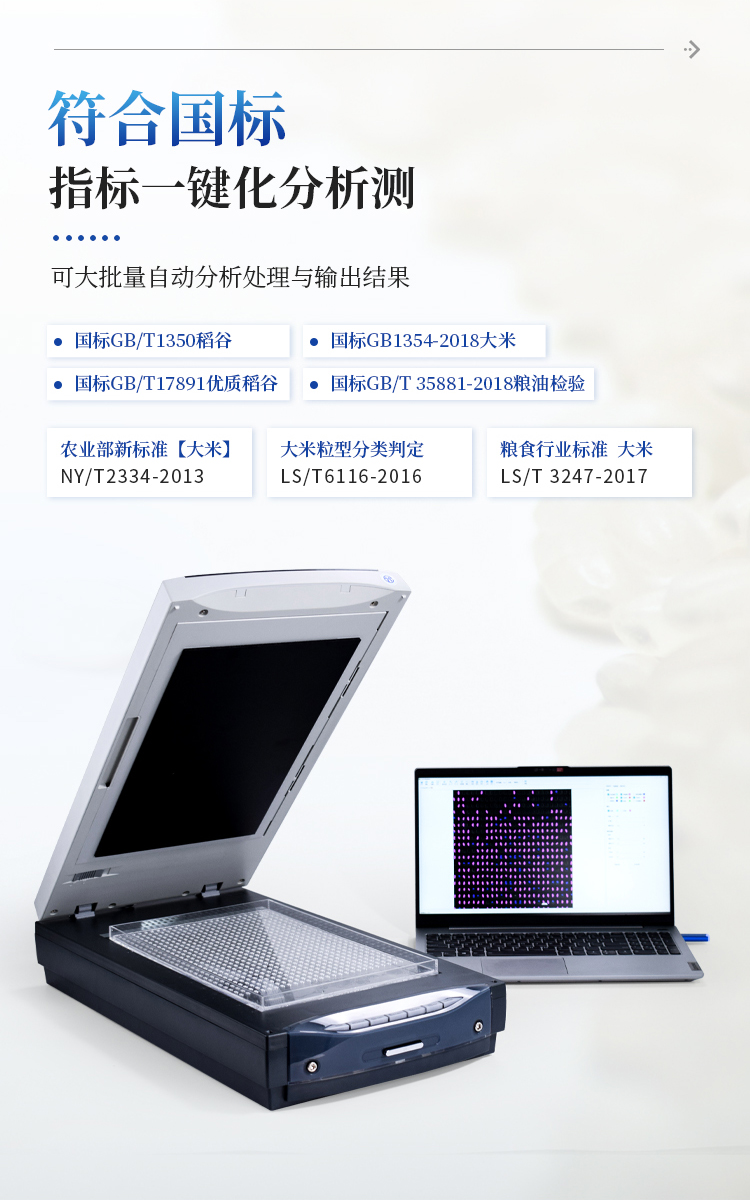 2、★可自动一次性测量分析1粒及以上大米样品的:垩白度/率、碎米率及小碎米率、整精米数量、整精米率、可直接检测大米透明度的国标等级、黄粒米、大米颜色黄度指数和大米白度测定、杂质量、异品种粒、不完善粒(未成熟粒)、裂纹率。还可测量糯米的阴米率、病斑或黄变率。糙米胚芽率。
