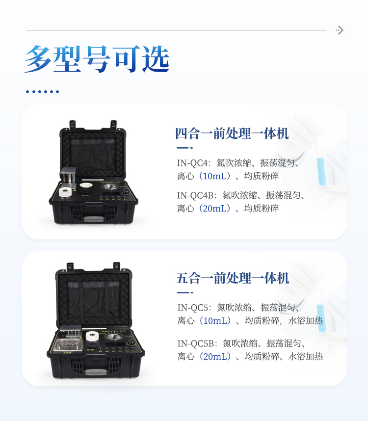 QC4型四合一样品检测前处理一体机(箱)是集吹干、离心、均质、混匀功能的一体化整合,极大的简化和集中样品前处理的一般操作过程,结合移动便携的工程塑料箱体,特别适合农兽药残留畜禽水产品质量安全现场快速检测。