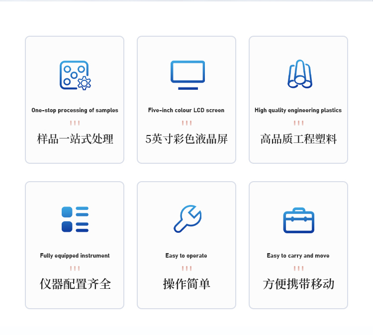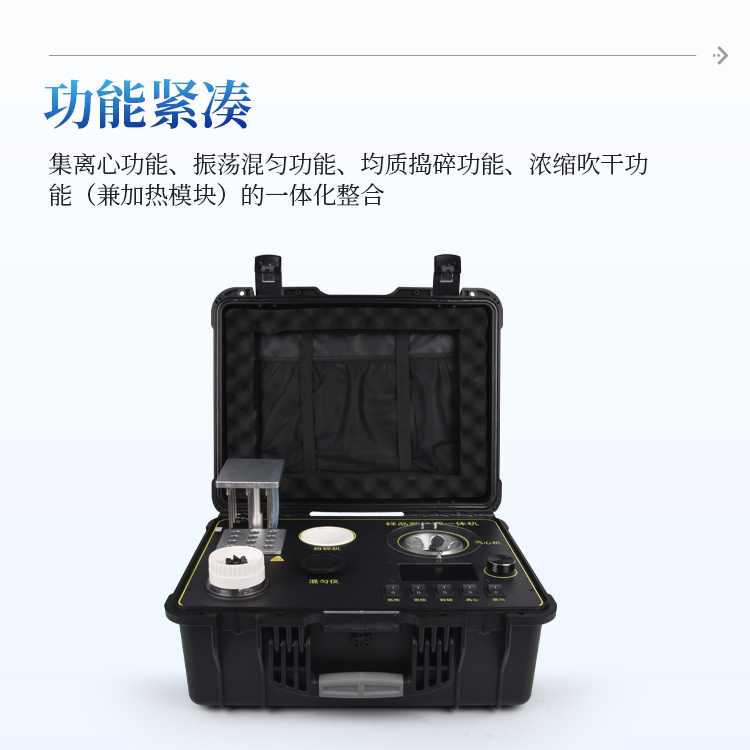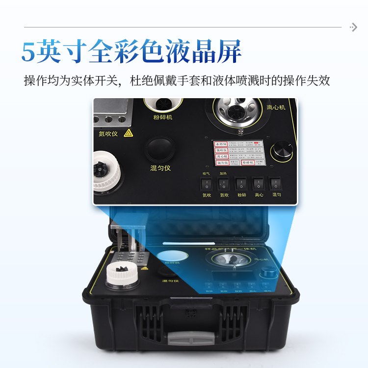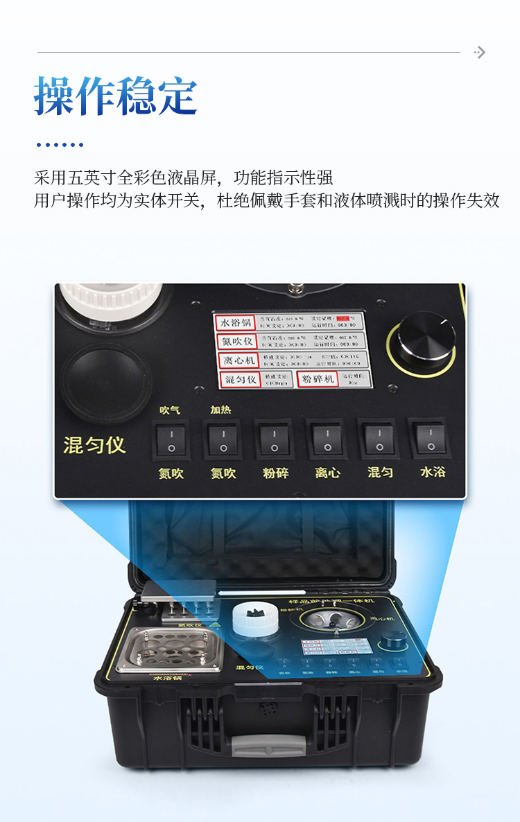 简要描述: 食品安全快检系统前处理一体机功能紧凑,集成五种样品前处理常用的功能,完成样品一站式处理。结构稳固,机箱采用高品质工程塑料,具备优秀的抗冲击性、耐腐蚀性、便携性。操作稳定,机器采用五寸全彩色液晶屏,功能指示性强,用户操作均为实体开关,杜绝佩戴手套和液体喷溅时的操作失效。