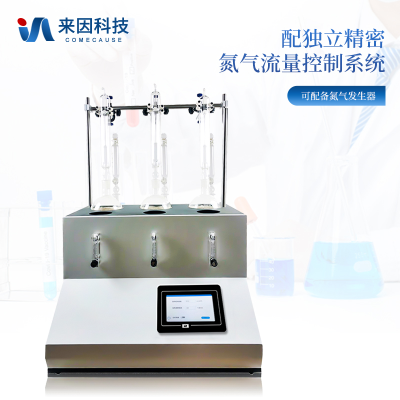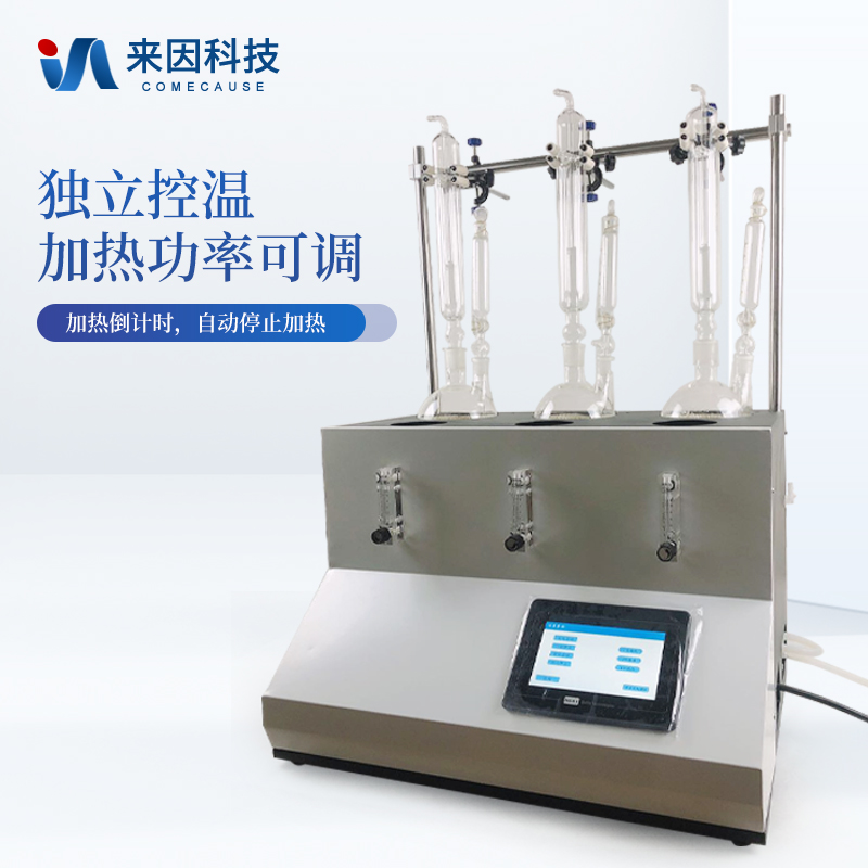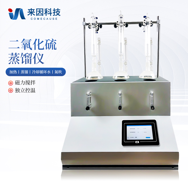 主要原理是根据药典中所提供的检测方法,将中药材以蒸馏法进行处理,样品中的亚硫酸盐系列物质加酸处理后转化为二氧化硫后,随氮气流带入到含有双氧水的吸收瓶中,双氧水将其氧化为硫酸根离子,采用酸碱滴定法测定,计算药材及饮片中的二氧化硫残留量。本产品在严格遵循药典要求的基础上,整合加热,蒸馏,水循环及氮吹等功能为一体,可同时提供3-5个样品(空白样,平行样)的处理,从而极大的提高了检测数据的精度和减少了工作时间。