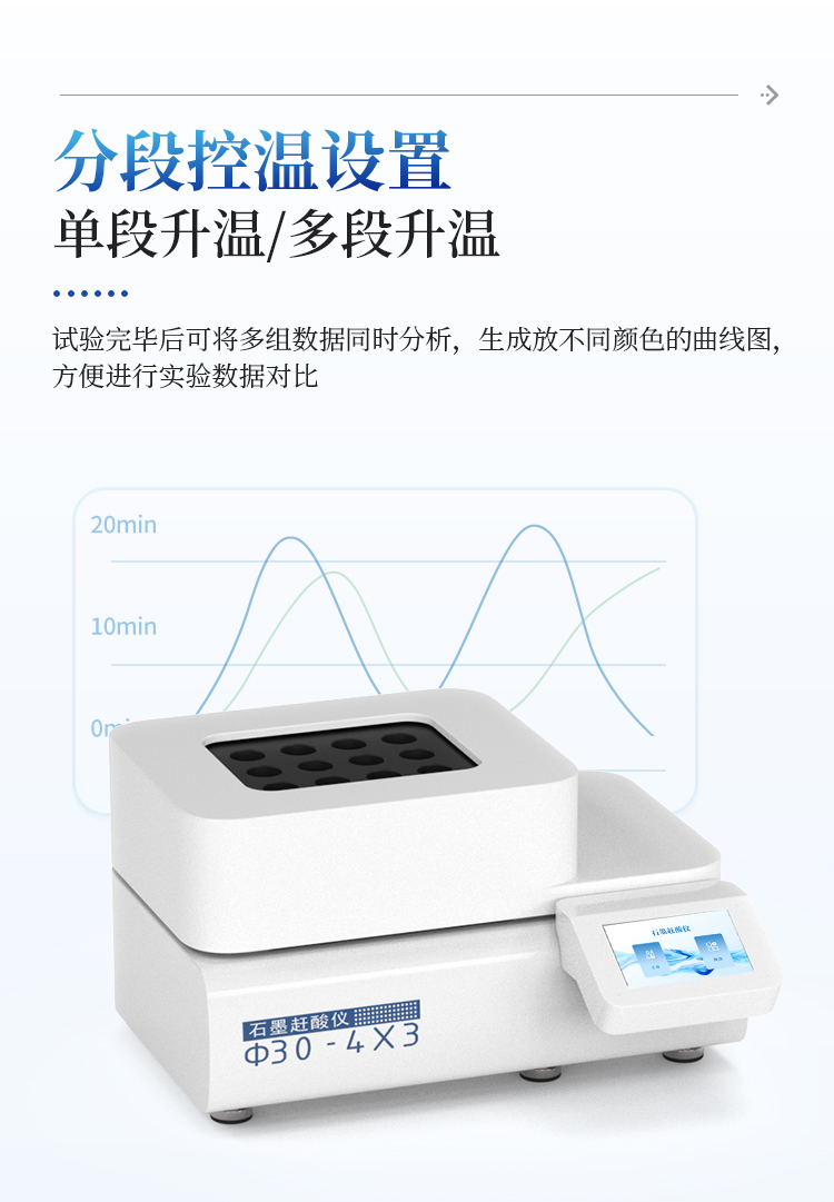 简要描述: 智能石墨消解仪采用优质高纯石墨材质,结合精确的环绕立体加热技术,确保消解孔间温差极小,有效保障了批量样品处理的平行性与结果准确性。智能PID温控系统支持高精度程序升温,用户可灵活设定并存储多组消解程序,操作简便,重现性极佳。同时,仪器具备超温保护、漏电保护等多重安全机制,配合耐腐蚀设计及友好的操作界面,在提升实验效率的同时,全力守护实验安全。