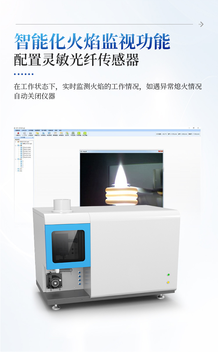 仪器配置了灵敏度极高的光纤传感器,可在仪器工作状态下,实时监测火焰的工作情况,如遇异常熄火情况,可自动关闭仪器。