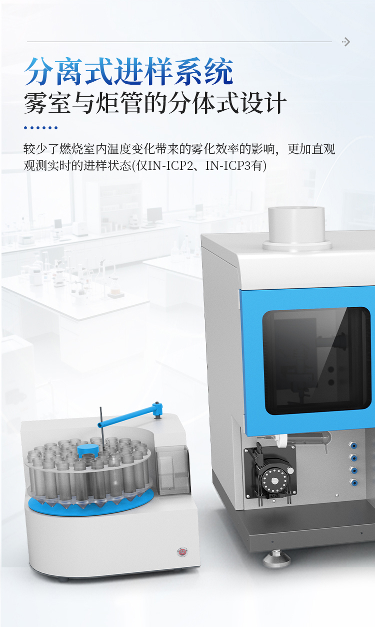 雾室与炬管的分体式设计,较少了燃烧室内温度变化带来的雾化效率的影响,更加直观的观测实时的进样状态。配合专利技术的加长型雾室,有效进行气液分离,较少水蒸气的干扰。