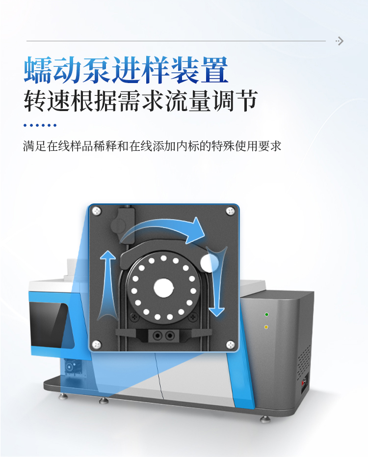 蠕动泵为 5 通道 16 转子全自动设计,蠕动泵转速可根据需求流量设置调节;可满足客户在线样品稀释和在线添加内标的特殊使用要求。
