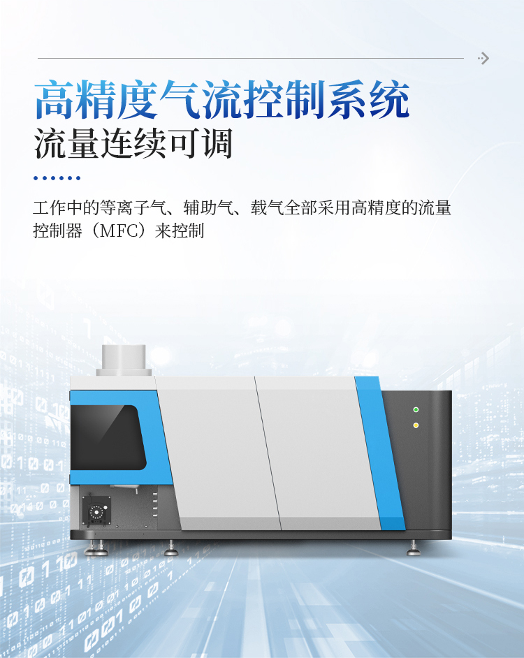 5、高精度的气流控制系统 :仪器工作中的等离子气、辅助气、载气全部采用高精度的质量流量控制器 (MFC)来控制,具有流量连续可调、输出气流的精度高,保证了测试数据的准确性。