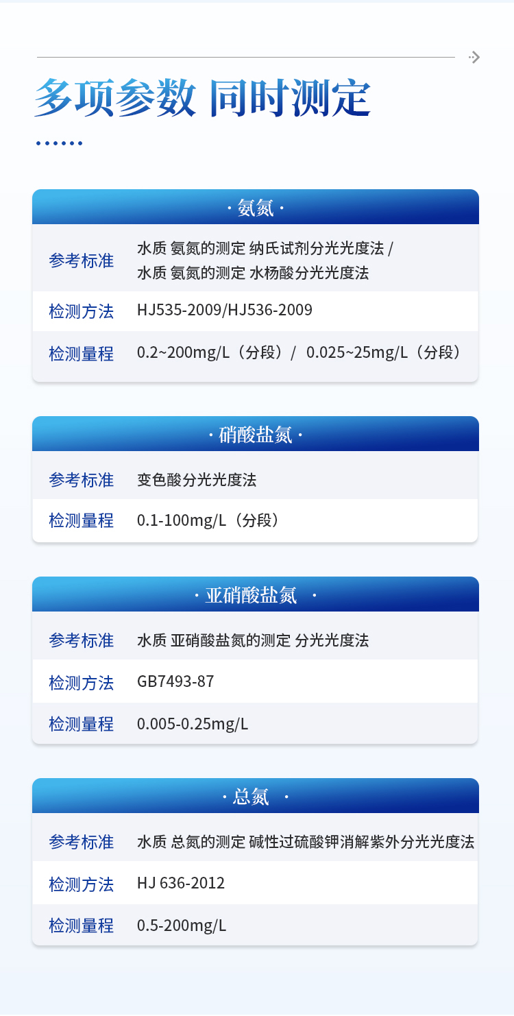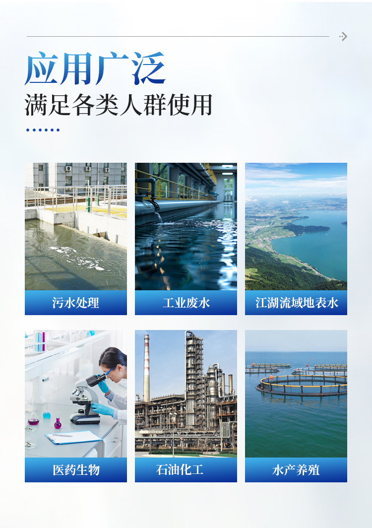 能够广泛的应用于各种行业(工业废水、城市污水、生活污水及江湖流域地表水)废水的检测,可适合不同用户的多种需求,可在化工、石油、焦化、造纸、冶金、酿造、医药等工业废水及各种生活污水监测应用。