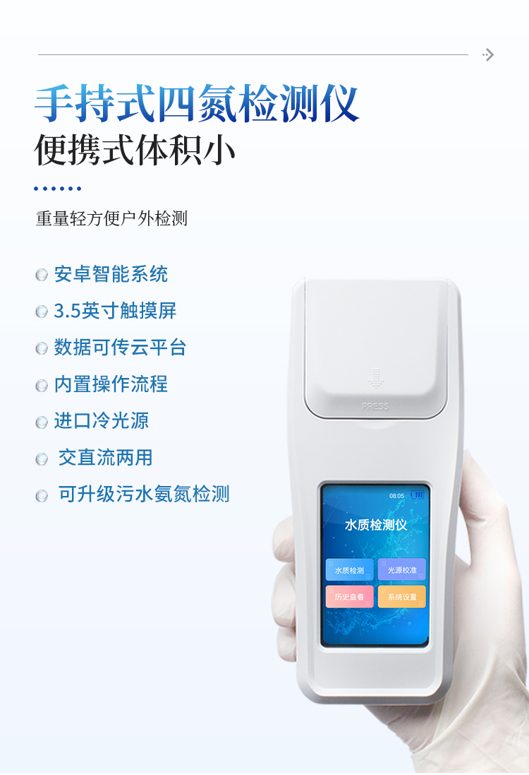 水质四氮检测仪是参考相关标准研发设计制造,本仪器主要检测水质氨氮、硝酸盐氮、亚硝酸盐氮、总氮浓度指标,兼具智能数据分析功能,图表、列表显示数据,分析一目了然;高清晰度彩色液晶触摸显示屏,Android智能操作系统,中文显示界面,中英文键盘,人性化操作,使用更简单。