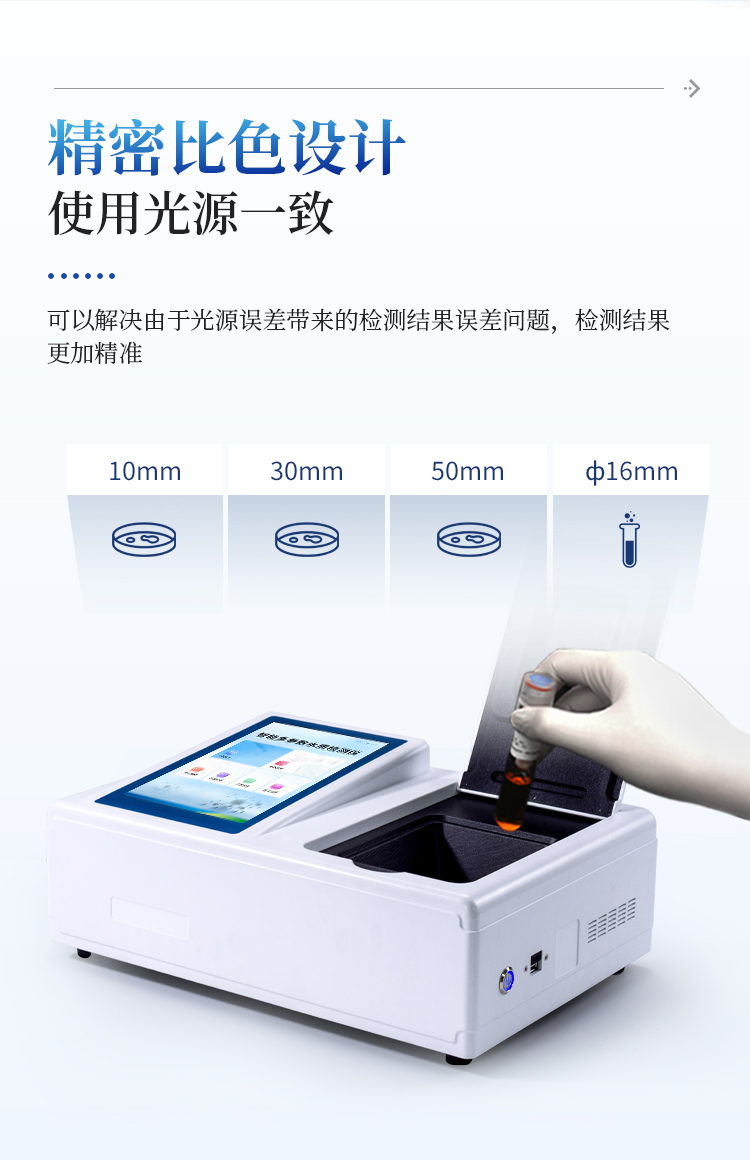 5、支持10mm、30mm、50mm皿比色和φ16mm管比色等比色方式,多元选择,确保测量的准确性;