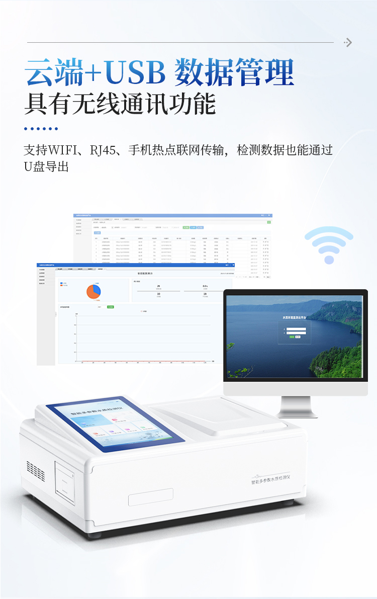 云平台:仪器带有监管平台,连接有线/无线网络,检测结果直接传输至环境安全监管平台。