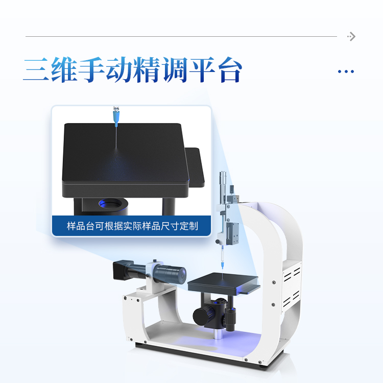 样品台采用三维手动精调平台,操作灵活,定位准确,样品台可根据实际样品尺寸定制;