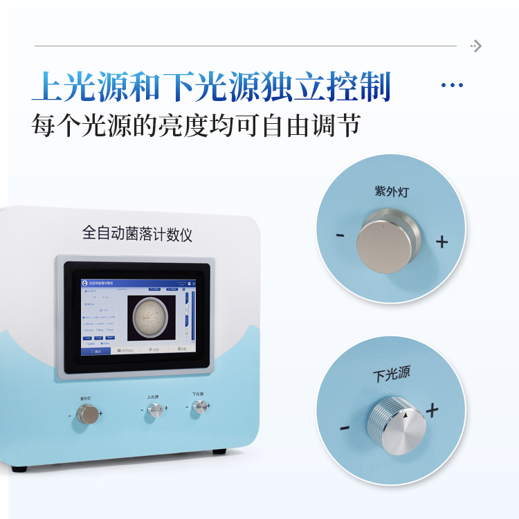 该系列全自动菌落计数仪配备了灵活的上、下双光源系统,用户可以根据不同培养皿的类型、菌落特性以及背景情况,用旋钮自由调节光源以获得最佳的成像效果。