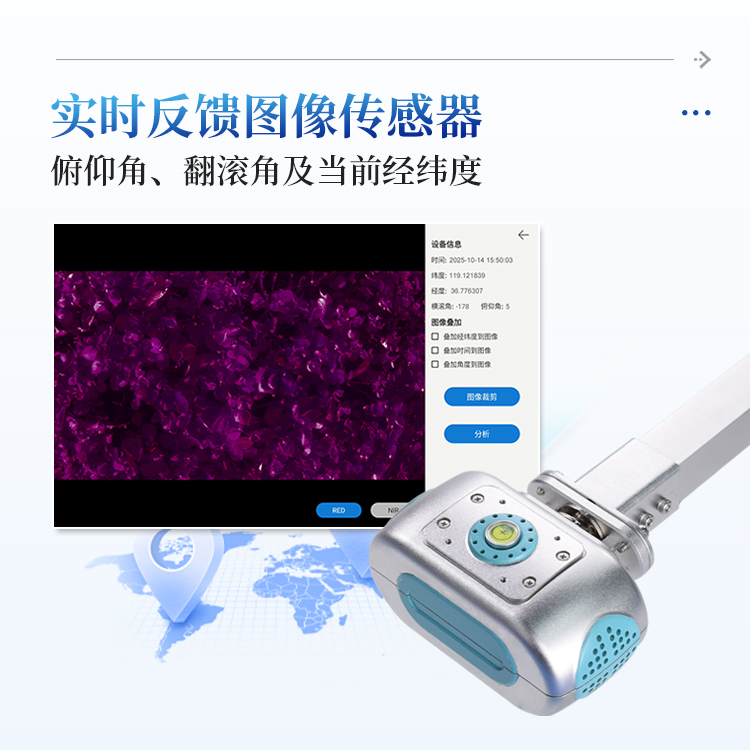 简要描述: 多光谱NDVI检测仪器主要用于草地、农田、湿地、林地等野外数据采样调查,使用方便快捷,精准获取高分辨率的RGB影像以及红光光谱、近红外光谱影像数据,自动计算植被覆盖度FVC,NDVI,LAI冠层等植被指数;可实时反馈图像传感器的俯仰角、翻滚角和方位角,当前经纬度。