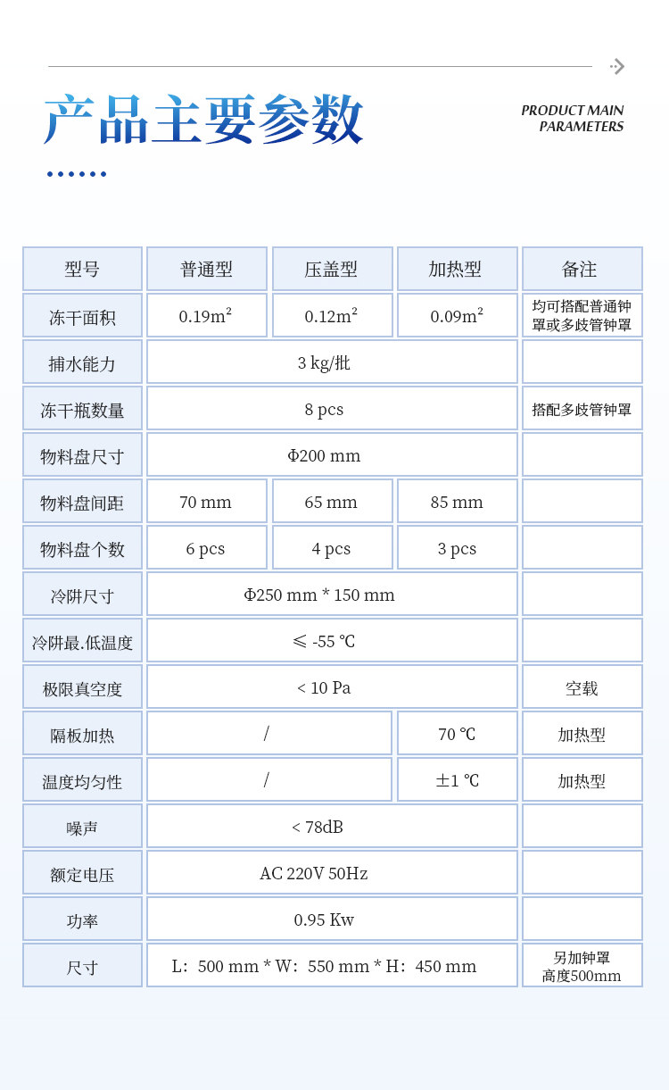 冻干面积 | 0.19 m² | 0.12 m² | 0.09 m² | 均可搭配普通钟罩或多歧管钟罩 |