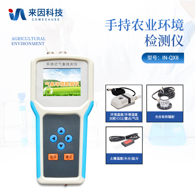 简要描述: 手持式智能农业气象环境检测仪IN-QX8是我们专门针对农田、草场局部小尺度环境设计的,对与植被和农作物生长密切相关的土壤、水气等环境参数监测的农田小气候站。它主要观测与农业相关的空气温度、空气湿度、光照强度、二氧化碳浓度、露点温度、光合有效辐射、土壤温度、土壤湿度等8个环境参数气象要素,为农业科研、农业生产等提供良好的支持。