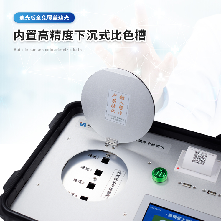 7.数据打印:内置热敏打印机(无需更换色带),可打印出检测项目、检测单位、检测人员、检测时间、通道号、吸光度、养分含量、以及二维码等信息。
