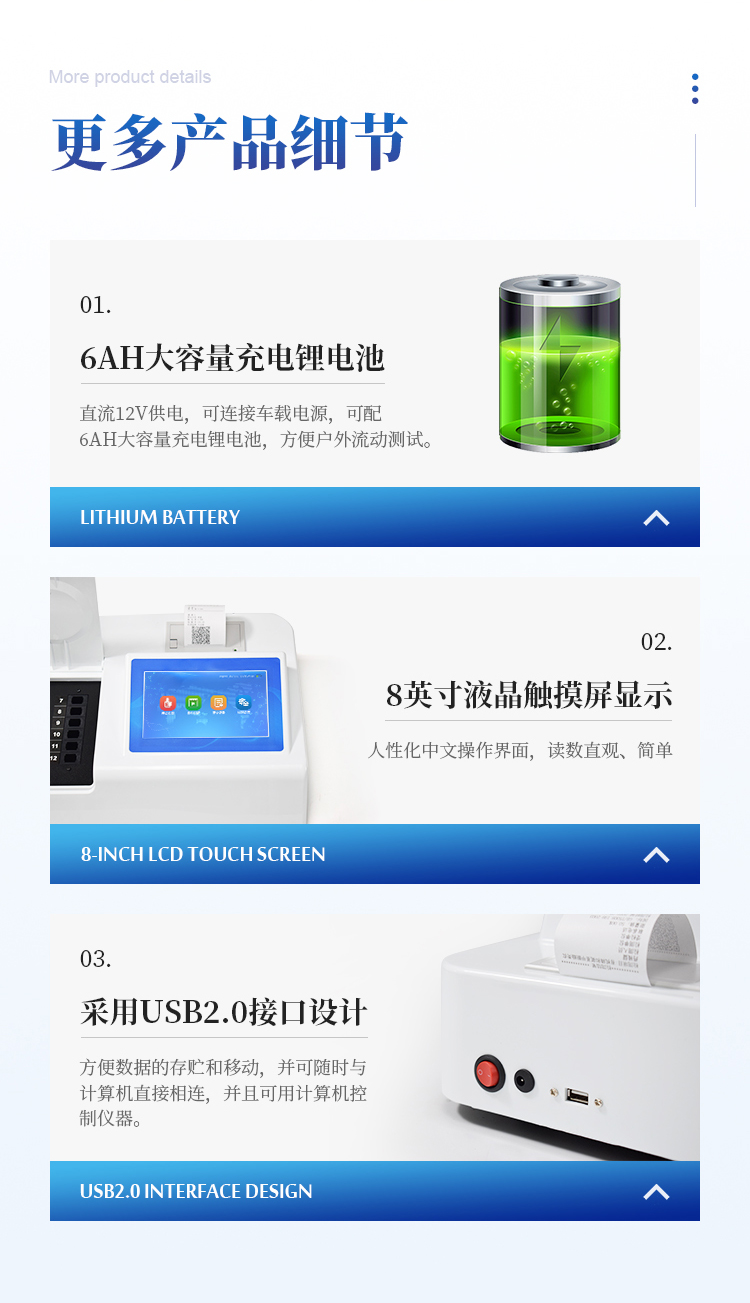 1、安卓智能操作系统,采用更加高效和人性化操作,仪器具有网线连接、wifi联网上传、GPRS无线远传功能,快速上传数据。