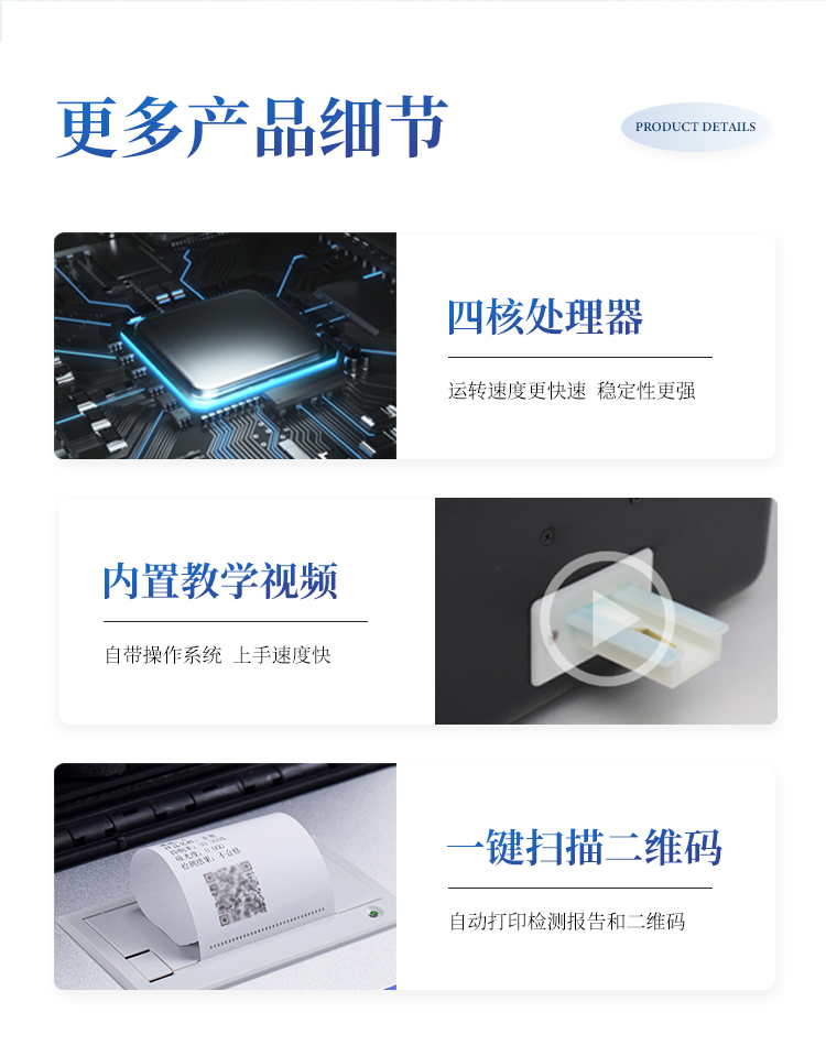 3、新一代高速热敏打印机,检测完成可自动打印检测报告和二维码。
